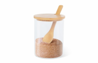 Průhledná skleněná nádoba s dřevěným víčkem a lžičkou. Vhodné pro uskladnění jakéhokoli koření, soli a cukru. Díky průhlednému držáku můžete snadno sledovat množství. - Vyrobeno ze dřeva a skla - Velký objem - Otvor na rukojeť Technické parametry: - Rozměr: O8 x 11 cm - Objem: 0,45 l - Hmotnost: 170 g